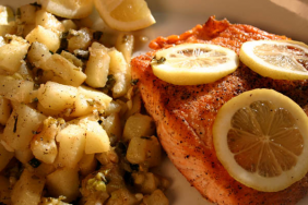 Salmon with Potatoes Recipe. A delicious, healthy salmon dish in less than 1/2 hour. The addition of lemon juice brings the salmon and potatoes into gastronomical harmony.